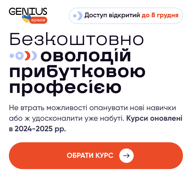 Освітня платформа Genius знову запускає ініціативу: українці отримують безкоштовний доступ до курсів та професійних програм. Це реальна можливість здобути знання в прибуткових digital-професіях — маркетинг, дизайн, IT, фріланс, AI та інші — або «приміряти» нову професію, щоб зрозуміти, чи підходить вона саме вам.