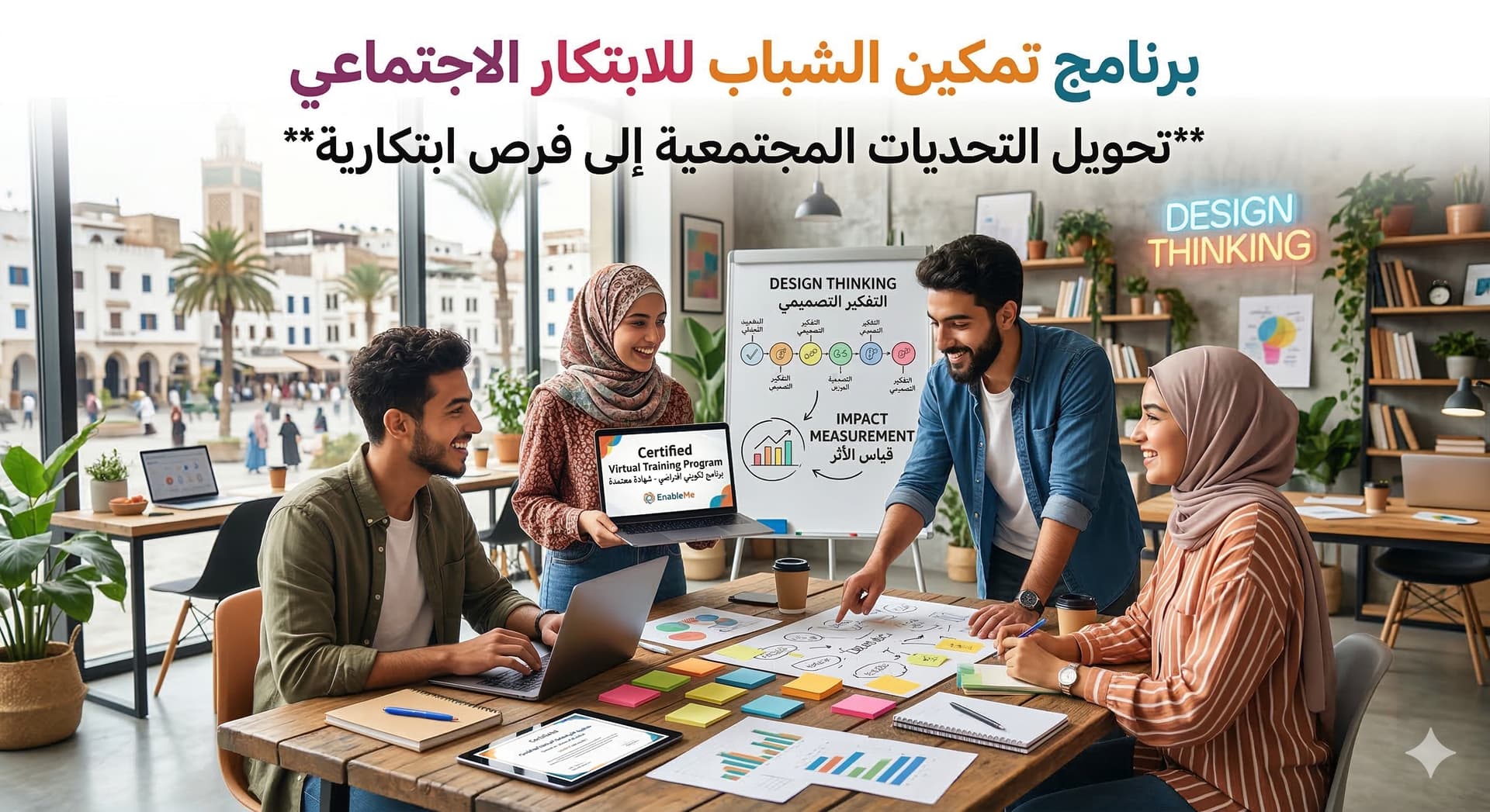 أتقاسم معكم ومعكن برنامج متكامل مصمم لتمكين الشباب العربي من تحويل التحديات المجتمعية إلى فرص ابتكارية، عبر إتقان لغة الابتكار، ومنهجية التفكير التصميمي، وأدوات قياس الأثر.