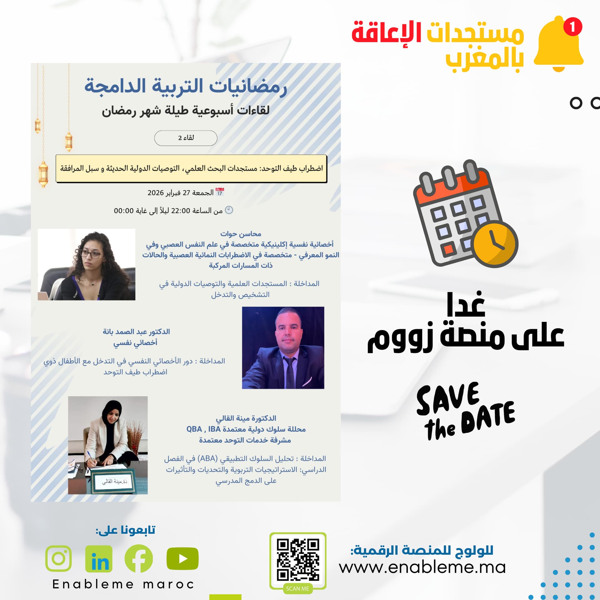 لقاء جديد من سلسلة رمضانيات التربية الدامجة، والذي سيخصص لموضوع اضطراب طيف التوحد، من خلال عرض آخر المستجدات العلمية والتوصيات الدولية وأدوار المتدخلين في التشخيص والتدخل والمواكبة.