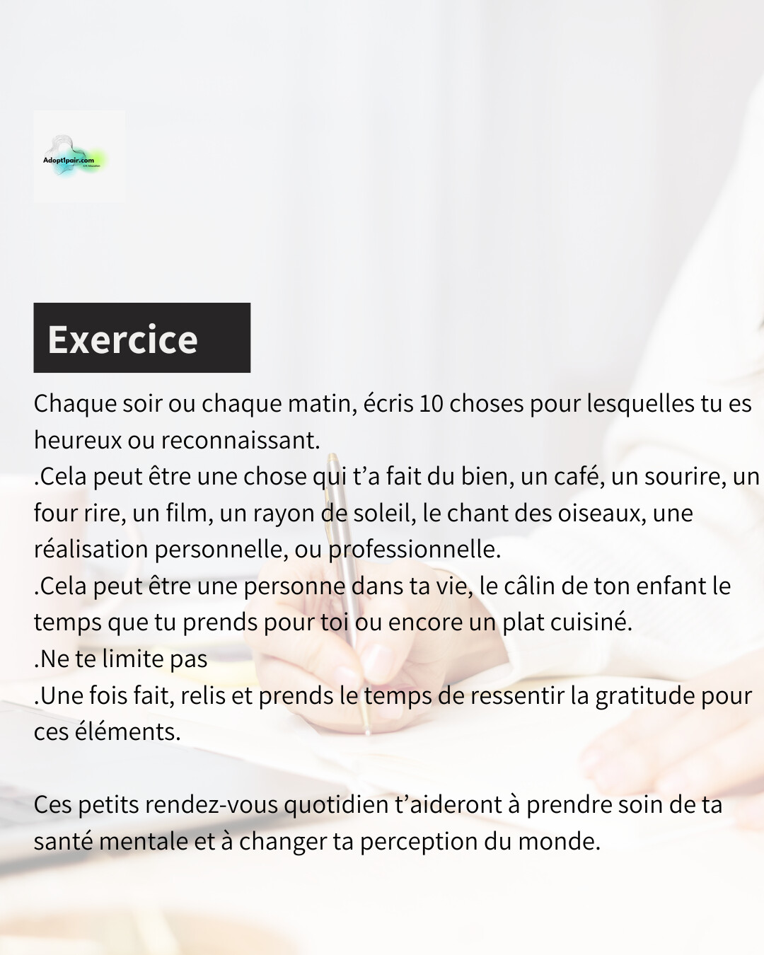 J'ai le plaisir de vous offrir ce petit exercice auquel je m'astreins chaque jour, cela m'aide à mieux "processer" et à voir mon quotidien plus positivement, pas toujours simple me direz vous quand on souffre de troubles psychiques ou d'addictions, et bien justement offrez vous ces petits rendez vous et ainsi je l'espère, ils vous aideront à trouver du mieux être au quotidien.