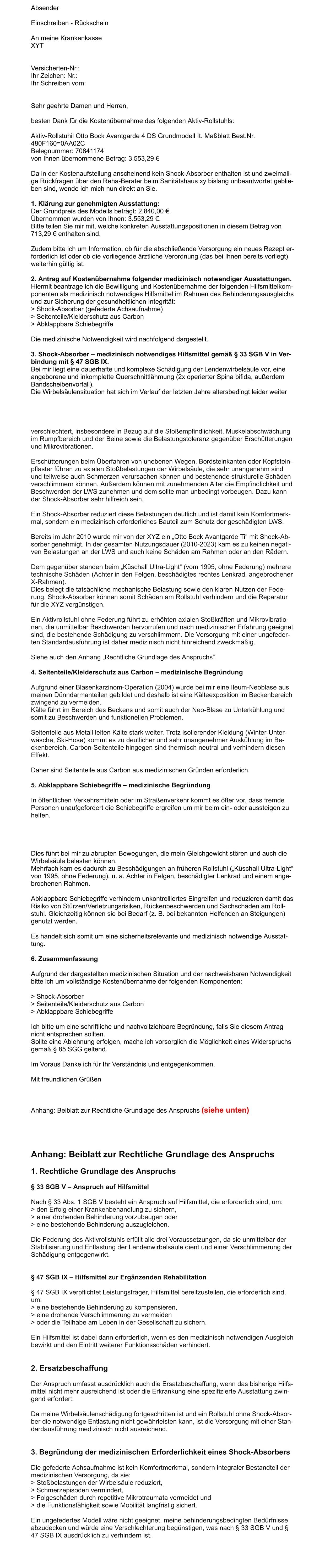 - 2010 hat meine Krankenkasse den Aktiv-Rollstuhl „Otto Bock Avantgarde Ti” mit Shock-Absorber finanziert.