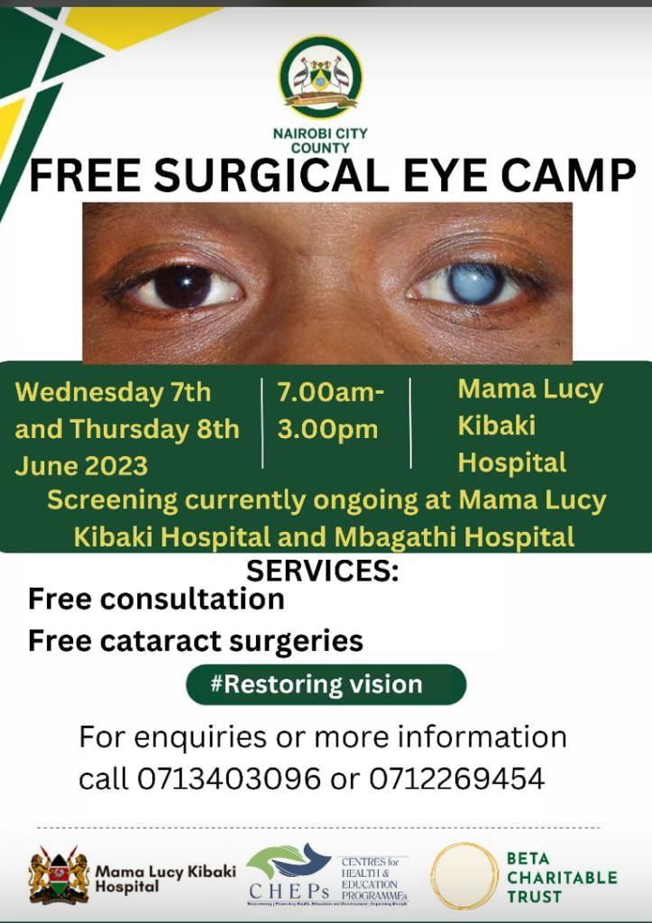 Free surgical eye camp between 7th and 8th June 2023 at 7:00 am to 3:00 pm at The Mama Lucy Kibaki Hospital. Screening currently happening at The Mama Lucy Kibaki and Mbagathi Hospital